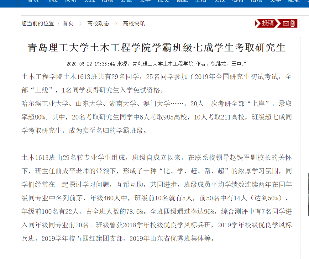 今日大学生网:青岛理工大学土木工程学院学霸班级七成学生考取研究生
