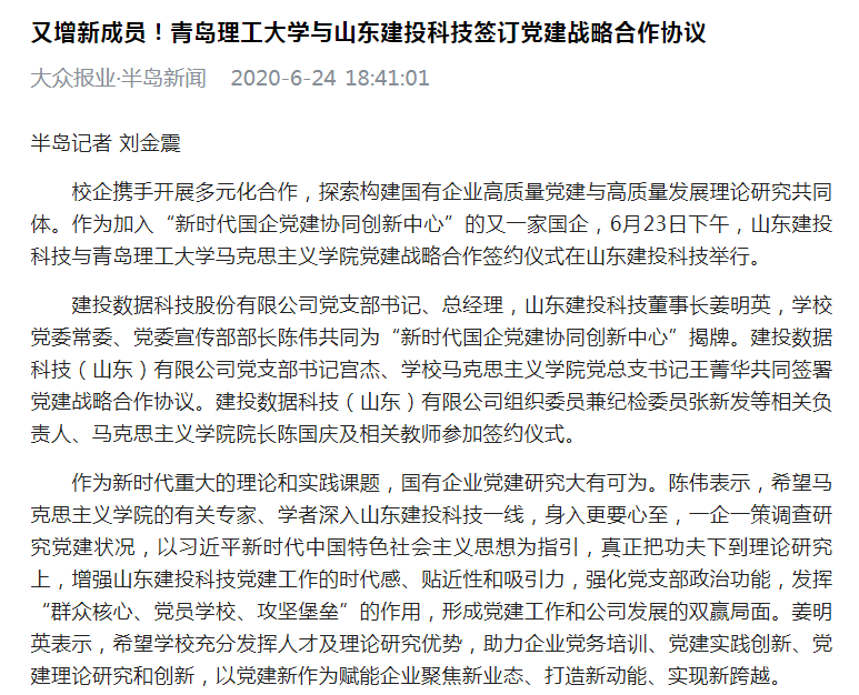 大众报业:又增新成员!青岛理工大学与山东建投科技签订党建战略合作协议
