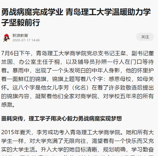 7月6日下午,青岛理工大学商学院党总支书记王粲、副书记董兰国、办公室主任于桐,以及辅导员孙照一行人在门口等待着。暴雨中,出现了一个头发斑白的中年人身影,他的怀里护着一面鲜红的锦旗,锦旗上题写着八个字:感恩母校,如母关怀。这八个字是他女儿李芳(化名)在看了许多致敬语后提出的锦旗内容,凝聚着他们全家对商学院、对学校五年来的所有感激。