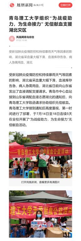 凤凰网:青岛理工大学组织“为战疫助力,为生命接力” 无偿献血支援湖北灾区