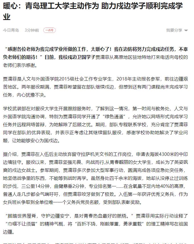 学校武装部在对服役大学生开展跟踪服务时,了解到这一情况,第一时间与教务处、人文与外国语学院沟通协调,特别为贾濡菲同学开通了“绿色通道”,允许她以网络形式完成学习任务并远程网络答辩,为她解除了后顾之忧。期间,部队专程联系学校,充分肯定了贾濡菲同学在部队的优异表现,并表示正考虑让其继续留队服役,感谢学校协助她解决了学业问题,让她能够安心为国戍边。