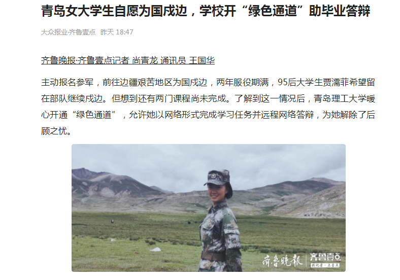 主动报名参军,前往边疆艰苦地区为国戍边,两年服役期满,95后大学生贾濡菲希望留在部队继续戍边。但想到还有两门课程尚未完成。了解到这一情况后,青岛理工大学暖心开通“绿色通道”,允许她以网络形式完成学习任务并远程网络答辩,为她解除了后顾之忧。