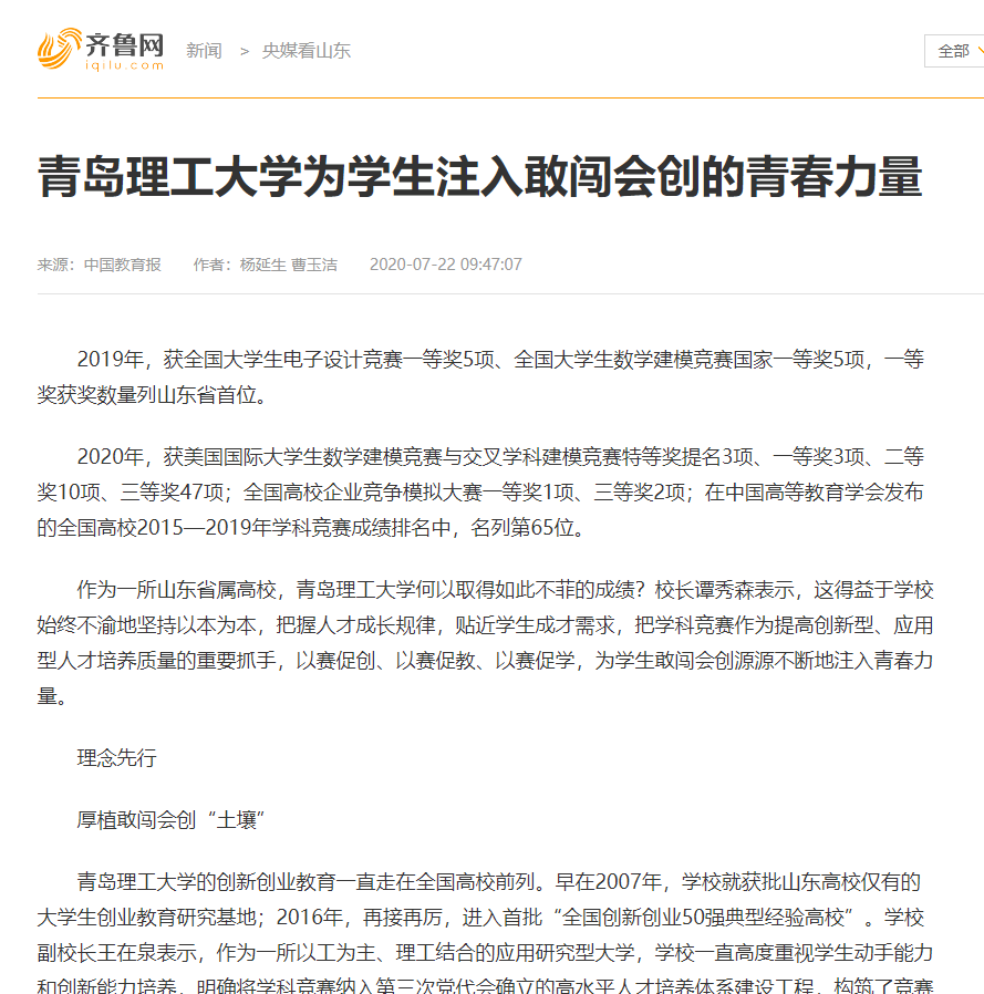齐鲁网:青岛理工大学为学生注入敢闯会创的青春力量