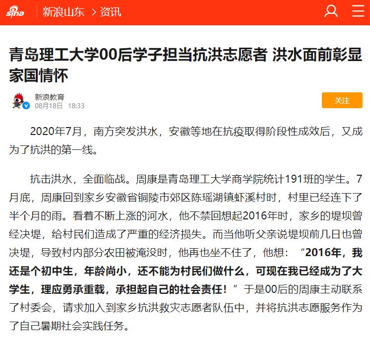 新浪:青岛理工大学00后学子担当抗洪志愿者 洪水面前彰显家国情怀