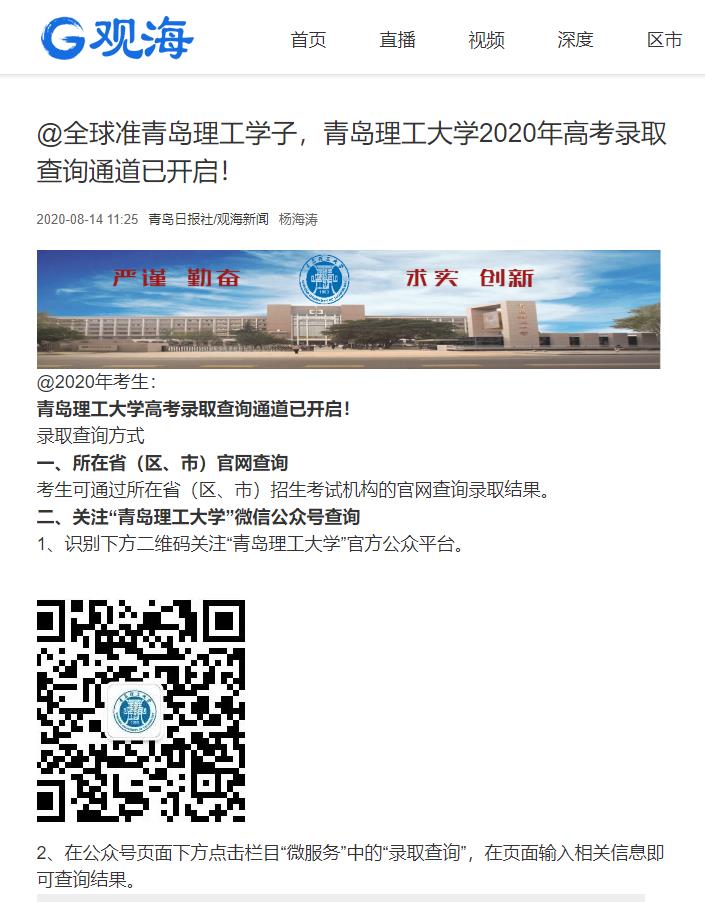观海:@全球准青岛理工学子,青岛理工大学2020年高考录取查询通道已开启!