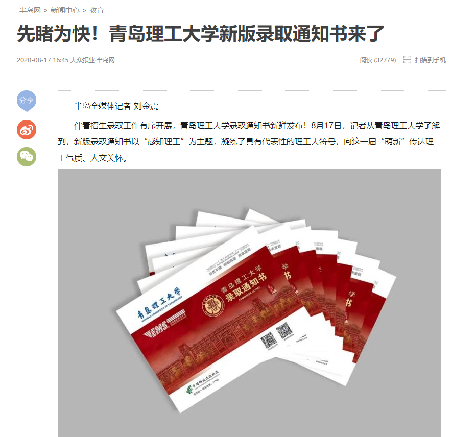 半岛网:先睹为快!青岛理工大学新版录取通知书来了
