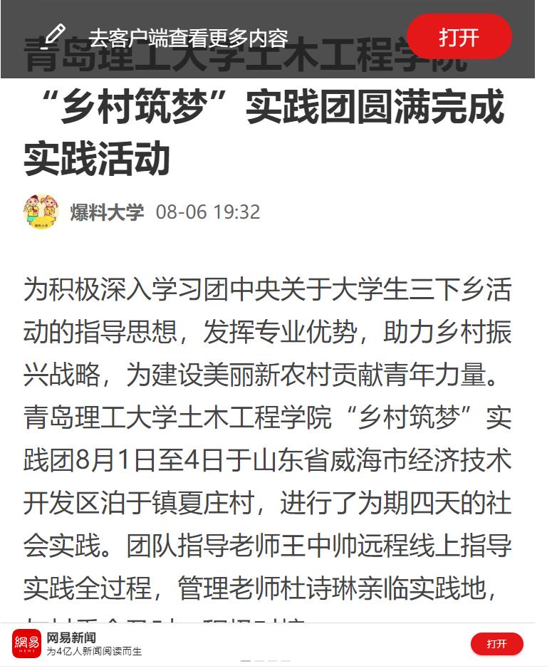 网易新闻客户端:青岛理工大学土木工程学院“乡村筑梦”实践团圆满完成实践活动