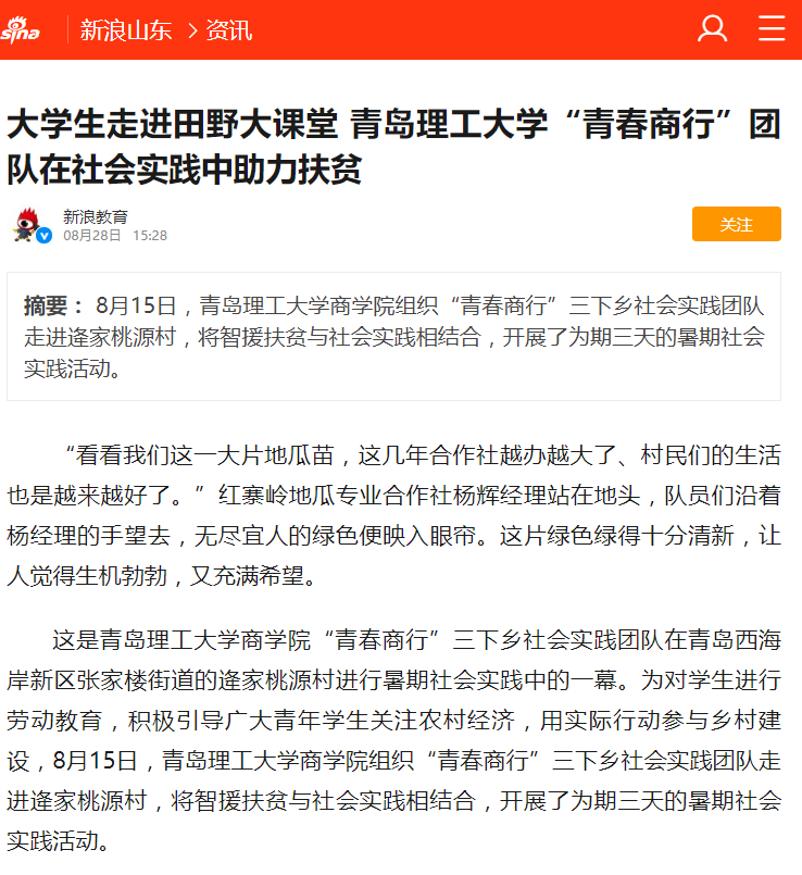 新浪:大学生走进田野大课堂 青岛理工大学“青春商行”团队在社会实践中助力扶贫