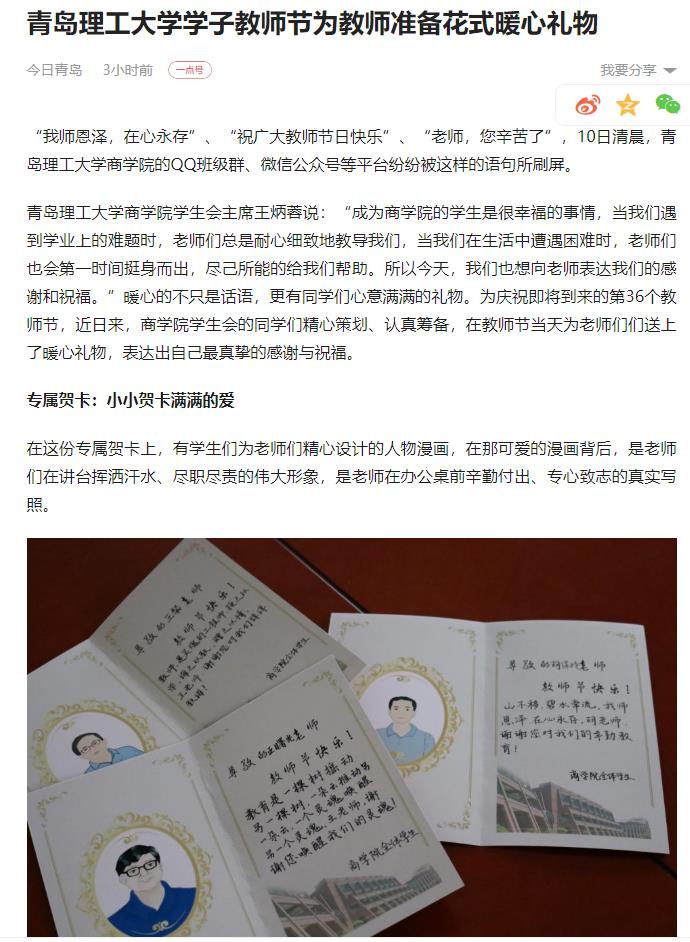 一点资讯:青岛理工大学学子教师节为教师准备花式暖心礼物