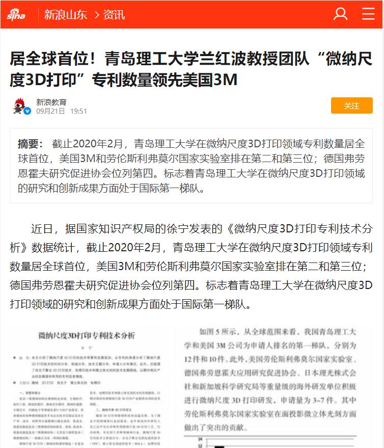 新浪:居全球首位!青岛理工大学兰红波教授团队“微纳尺度3D打印”专利数量领先美国3M