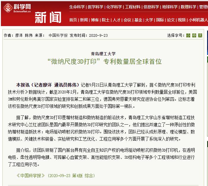 科学网:青岛理工“微纳尺度3D打印”专利数量居全球首位