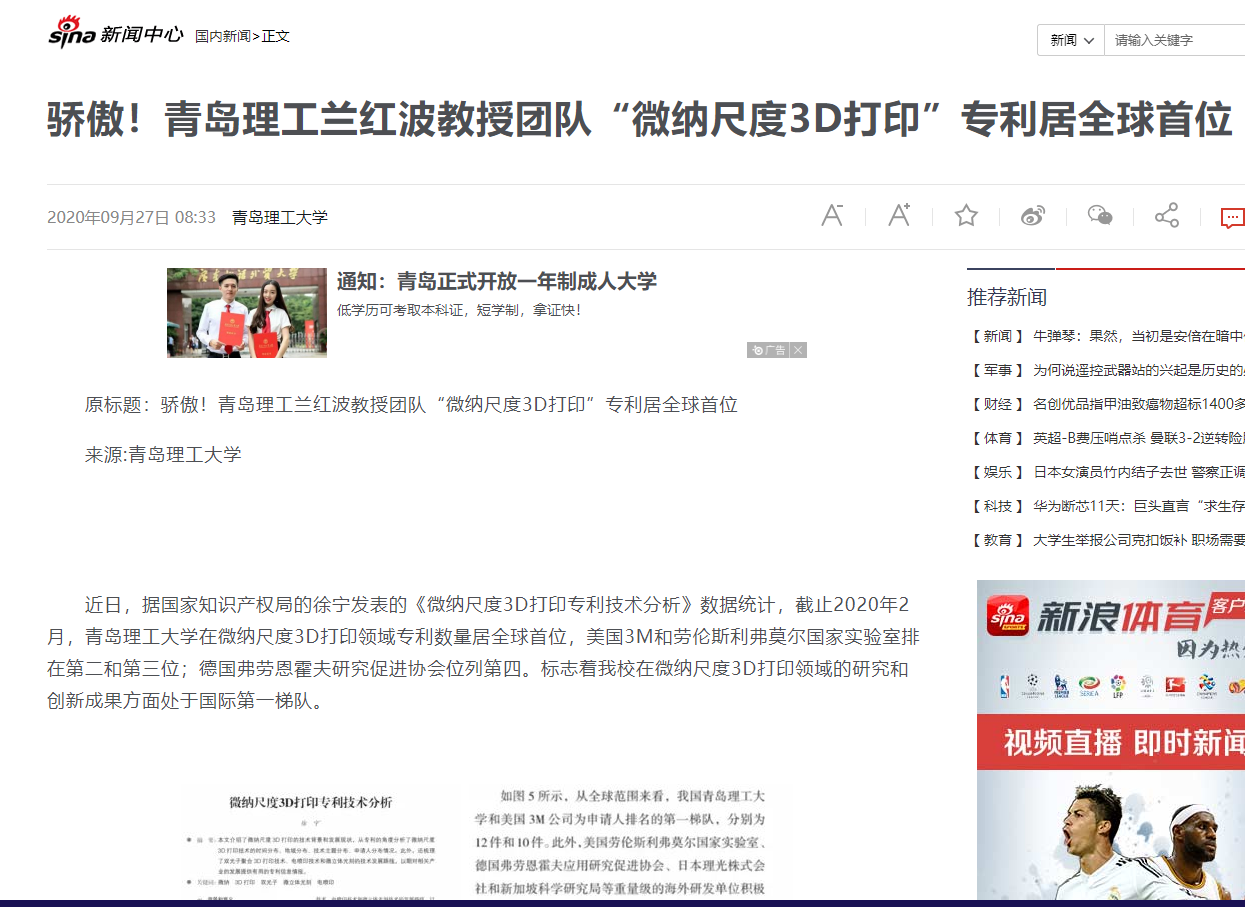 新浪:骄傲!青岛理工兰红波教授团队“微纳尺度3D打印”专利居全球首位