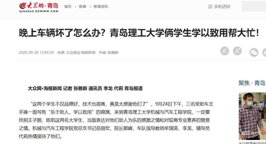 大众网:晚上车辆坏了怎么办?青岛理工大学俩学生学以致用帮大忙!