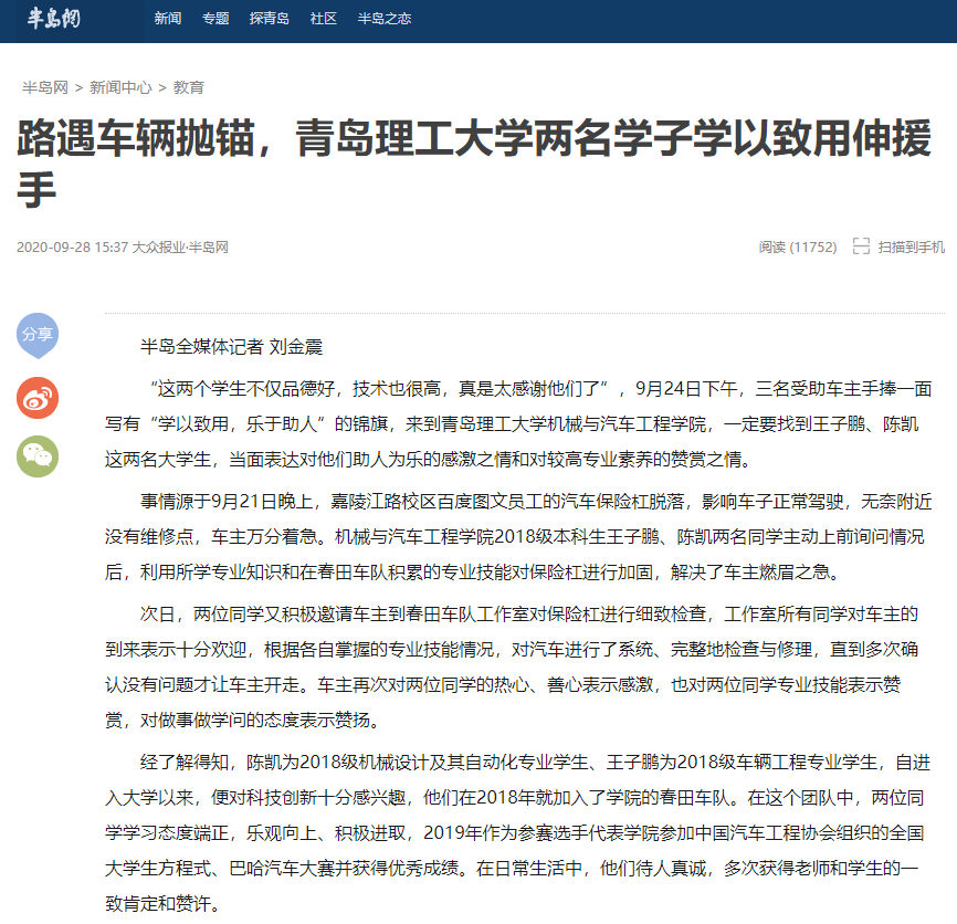 大众报业·半岛网:路遇车辆抛锚,青岛理工大学两名学子学以致用伸援手