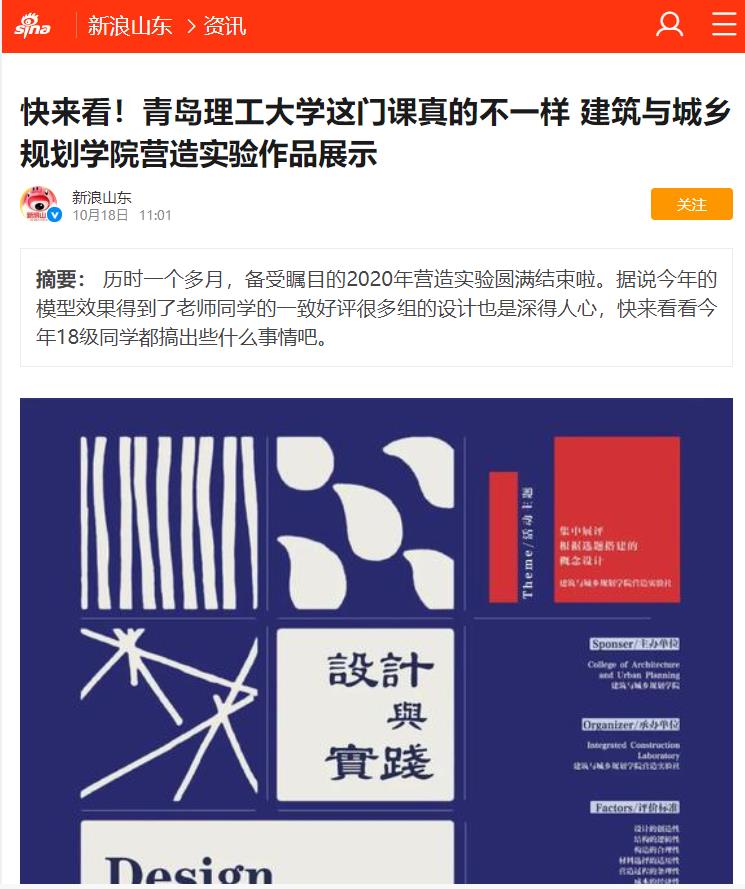 新浪:快来看!青岛理工大学这门课真的不一样 建筑与城乡规划学院营造实验作品展示