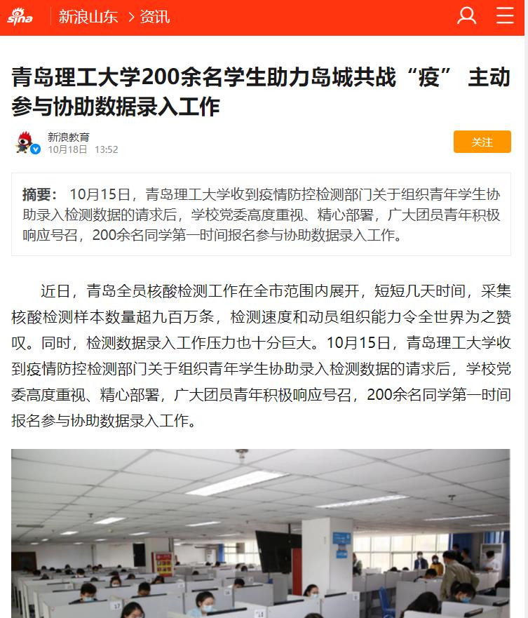 新浪:青岛理工大学200余名学生助力岛城共战“疫” 主动参与协助数据录入工作