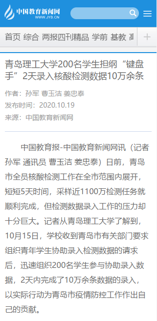 中国教育新闻网:青岛理工大学200名学生担纲“键盘手”2天录入核酸检测数据10万余条