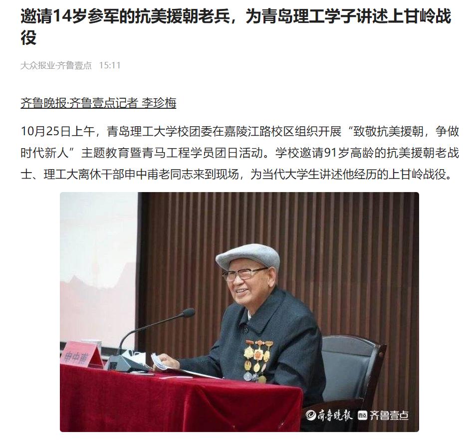 齐鲁壹点:邀请14岁参军的抗美援朝老兵,为青岛理工学子讲述上甘岭战役