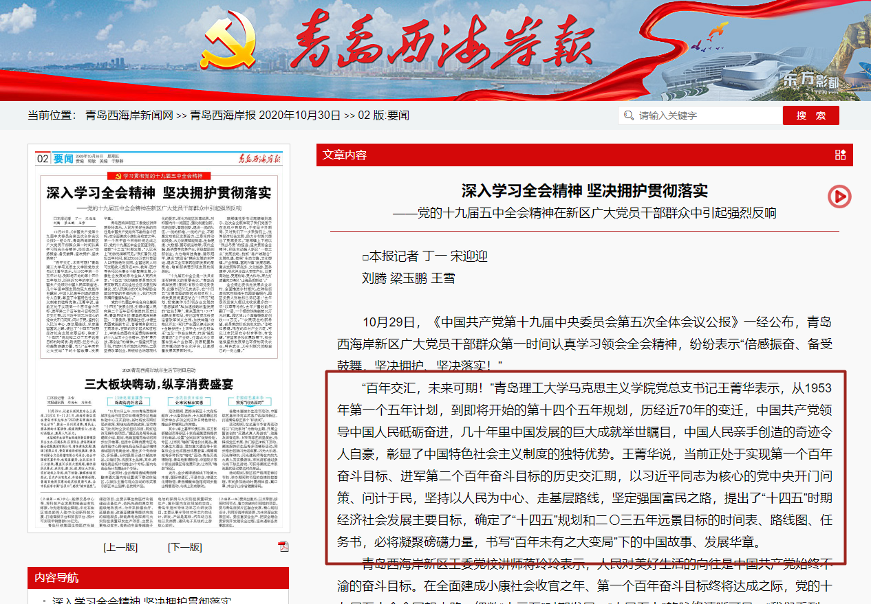 青岛西海岸报:深入学习全会精神 坚决拥护贯彻落实——党的十九届五中全会精神在新区广大党员干部群众中引起强烈反响