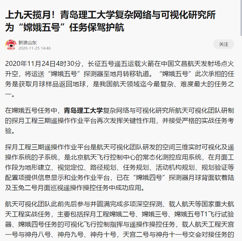 新浪山东:上九天揽月!青岛理工大学复杂网络与可视化研究所为“嫦娥五号”任务保驾护航