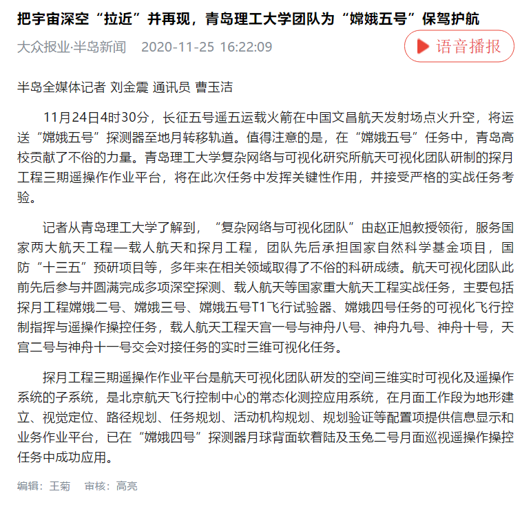 青岛财经网;青岛理工大复杂网络与可视化研究所为“嫦娥五号”任务保驾护航