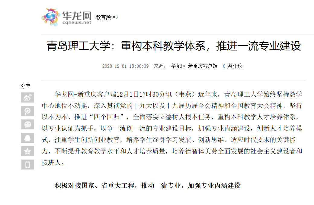 华龙网-新重庆客户端12月1日17时30分讯(韦燕)近年来,青岛理工大学始终坚持教学中心地位不动摇,深入贯彻党的十九大以及十九届历届全会精神和全国教育大会精神,坚持以本为本、推进“四个回归”,全面落实立德树人根本任务,重构本科教学人才培养体系,以专业认证为抓手,以争一流创一流的专业建设目标,加强专业内涵建设,创新人才培养模式,注重学生创新创业教育,培养学生终身学习发展、创新思维、适应时代要求的关键能力,不断提升教育教学水平和人才培养质量,培养德智体美劳全面发展的社会主义建设者和接班人。