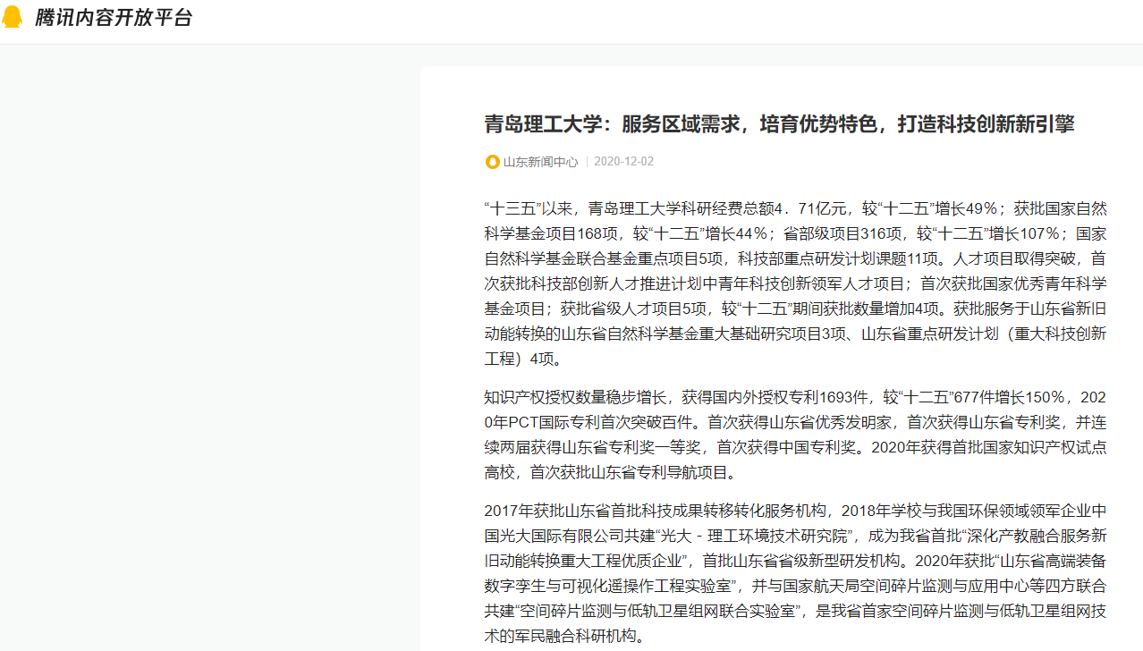 2017年获批山东省首批科技成果转移转化服务机构,2018年学校与我国环保领域领军企业中国光大国际有限公司共建“光大-理工环境技术研究院”,成为我省首批“深化产教融合服务新旧动能转换重大工程优质企业”,首批山东省省级新型研发机构。2020年获批“山东省高端装备数字孪生与可视化遥操作工程实验室”,并与国家航天局空间碎片监测与应用中心等四方联合共建“空间碎片监测与低轨卫星组网联合实验室”,是我省首家空间碎片监测与低轨卫星组网技术的军民融合科研机构。