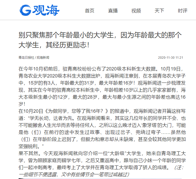 在10月20日《为做同学,您等了我16年?》的报道中,观海新闻记者开篇这样写道:“学无长幼,达者为先。在观海新闻看来,其实这几位年长的同学并不会、也不可能撇舍人生光华而去等待任何人,之所以这么晚才迈入‘象牙塔’的大门,可能是他(们)在前行的途中发生过故事、出现过岔子、兜绕过弯子……虽然他(们)在年龄阶段上迟到了,但毅力和意志却从未缺席,甚至会较其他同学更加坚强锐利。”
