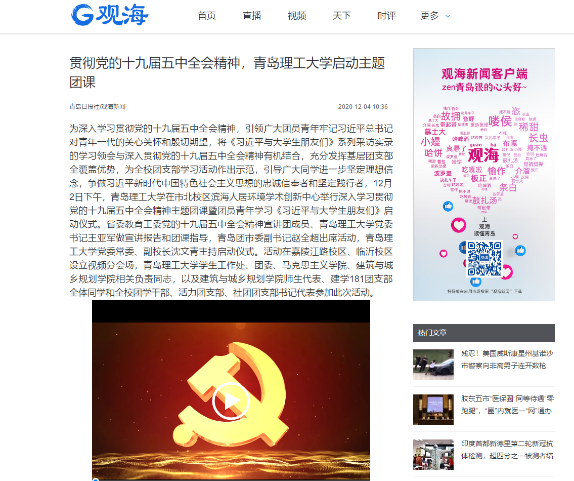 为深入学习贯彻党的十九届五中全会精神,引领广大团员青年牢记习近平总书记对青年一代的关心关怀和殷切期望,将《习近平与大学生朋友们》系列采访实录的学习领会与深入贯彻党的十九届五中全会精神有机结合,充分发挥基层团支部全覆盖优势,为全校团支部学习活动作出示范,引导广大同学进一步坚定理想信念,争做习近平新时代中国特色社会主义思想的忠诚信奉者和坚定践行者,12月2日下午,青岛理工大学在市北校区滨海人居环境学术创新中心举行深入学习贯彻党的十九届五中全会精神主题团课暨团员青年学习《习近平与大学生朋友们》启动仪式。省委教育工委党的十九届五中全会精神宣讲团成员、青岛理工大学党委书记王亚军做宣讲报告和团课指导,青岛团市委副书记赵全超出席活动,青岛理工大学党委常委、副校长沈文青主持启动仪式。活动在嘉陵江路校区、临沂校区设立视频分会场,青岛理工大学学生工作处、团委、马克思主义学院、建筑与城乡规划学院相关负责同志,以及建筑与城乡规划学院师生代表、建学181团支部全体同学和全校团学干部、活力团支部、社团团支部书记代表参加此次活动。