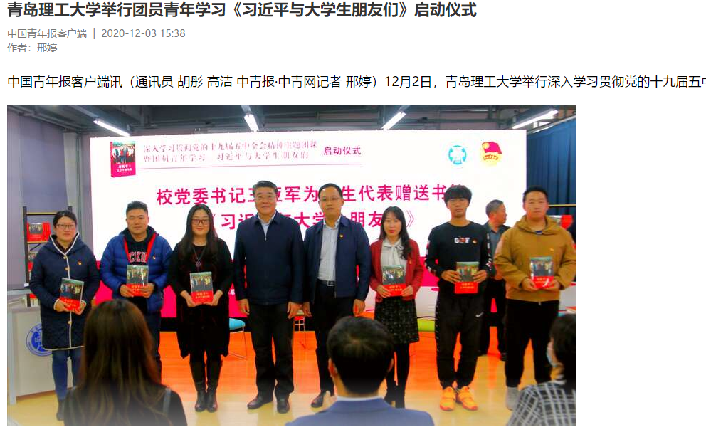 中国青年报客户端讯(通讯员 胡彤 高洁 中青报·中青网记者 邢婷)12月2日,青岛理工大学举行深入学习贯彻党的十九届五中全会精神主题团课暨团员青年学习《习近平与大学生朋友们》启动仪式。