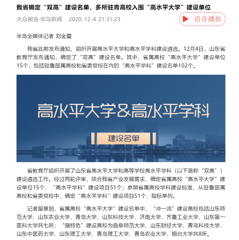 据悉,近年来,山东高等教育实现了长足发展,取得了较大成绩,但与先进省份相比,我省高等教育大而不强、支撑经济社会发展能力不足等问题仍很突出。为此,我省先后印发《山东省高水平大学建设实施方案》《山东省高等学校高水平学科建设实施方案》,进一步推进高等教育高质量发展、加快“双一流”建设。根据建设实施方案,我省按照“筑高峰”“冲一流”“强特色”三种类型,重点建设一批高水平大学。在高水平学科建设方面,着眼于服务国家重大战略和我省“八大发展战略”,重点打造一批优势特色学科,前瞻布局一批新兴交叉学科,引领带动一批人才培养质量高、科研服务能力强的学科群。