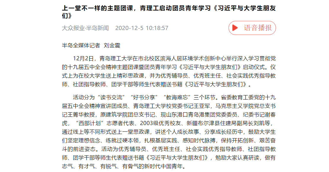 12月2日,青岛理工大学在市北校区滨海人居环境学术创新中心举行深入学习贯彻党的十九届五中全会精神主题团课暨团员青年学习《习近平与大学生朋友们》启动仪式。仪式上为在校大学生送上精彩思政课,并为优秀辅导员、优秀班主任、社会实践优秀指导教师、社团指导教师、团学干部等师生代表赠送书籍《习近平与大学生朋友们》。