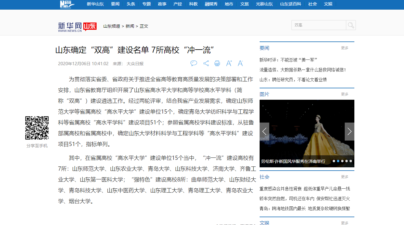 为贯彻落实省委、省政府关于推进全省高等教育高质量发展的决策部署和工作安排,山东省教育厅组织开展了山东省高水平大学和高等学校高水平学科(简称“双高”)建设遴选工作。经过两轮评审,结合我省产业发展需求,确定山东师范大学等省属高校“高水平大学”建设单位15个,确定青岛大学纺织科学与工程学科等省属高校“高水平学科”建设项目51个;参照省属高校学科建设标准,从驻鲁部属高校和省属高校中,确定山东大学材料科学与工程学科等“高水平学科”建设项目51个,指标单列。