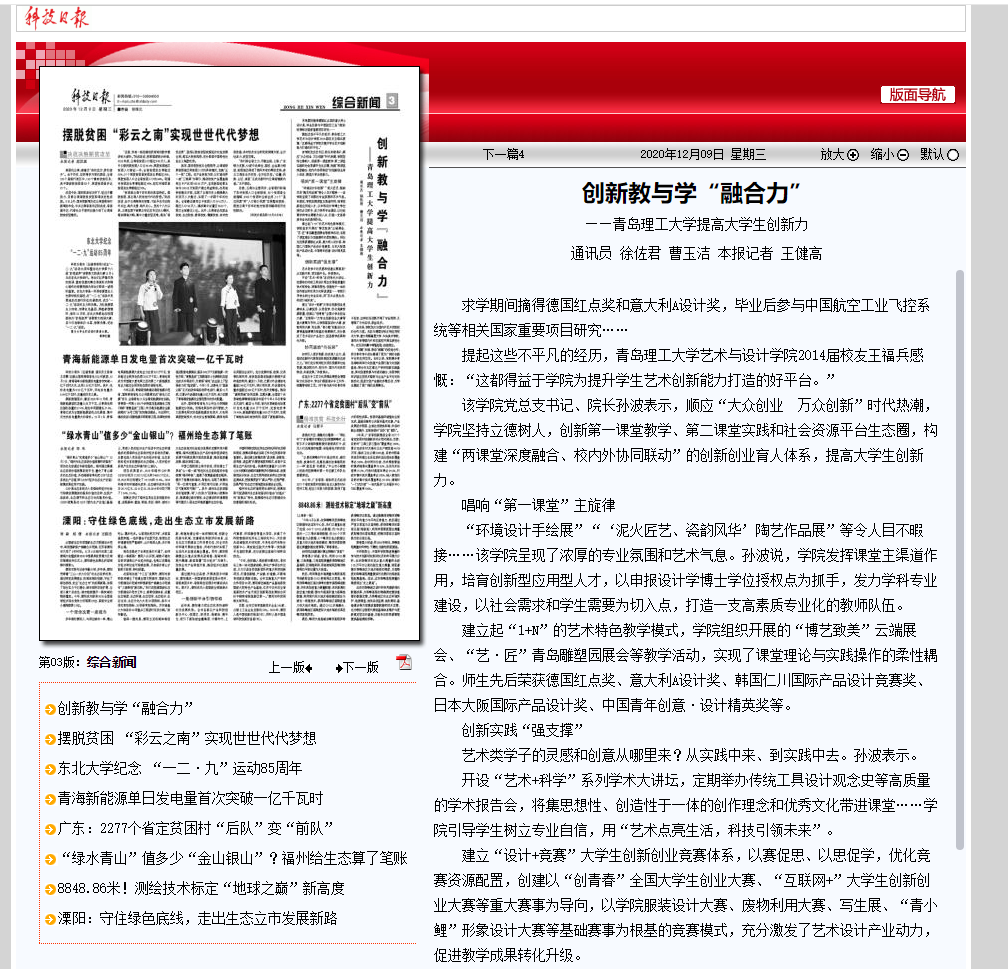 建立起“1+N”的艺术特色教学模式,学院组织开展的“博艺致美”云端展会、“艺·匠”青岛雕塑园展会等教学活动,实现了课堂理论与实践操作的柔性耦合。师生先后荣获德国红点奖、意大利A设计奖、韩国仁川国际产品设计竞赛奖、日本大阪国际产品设计奖、中国青年创意·设计精英奖等。