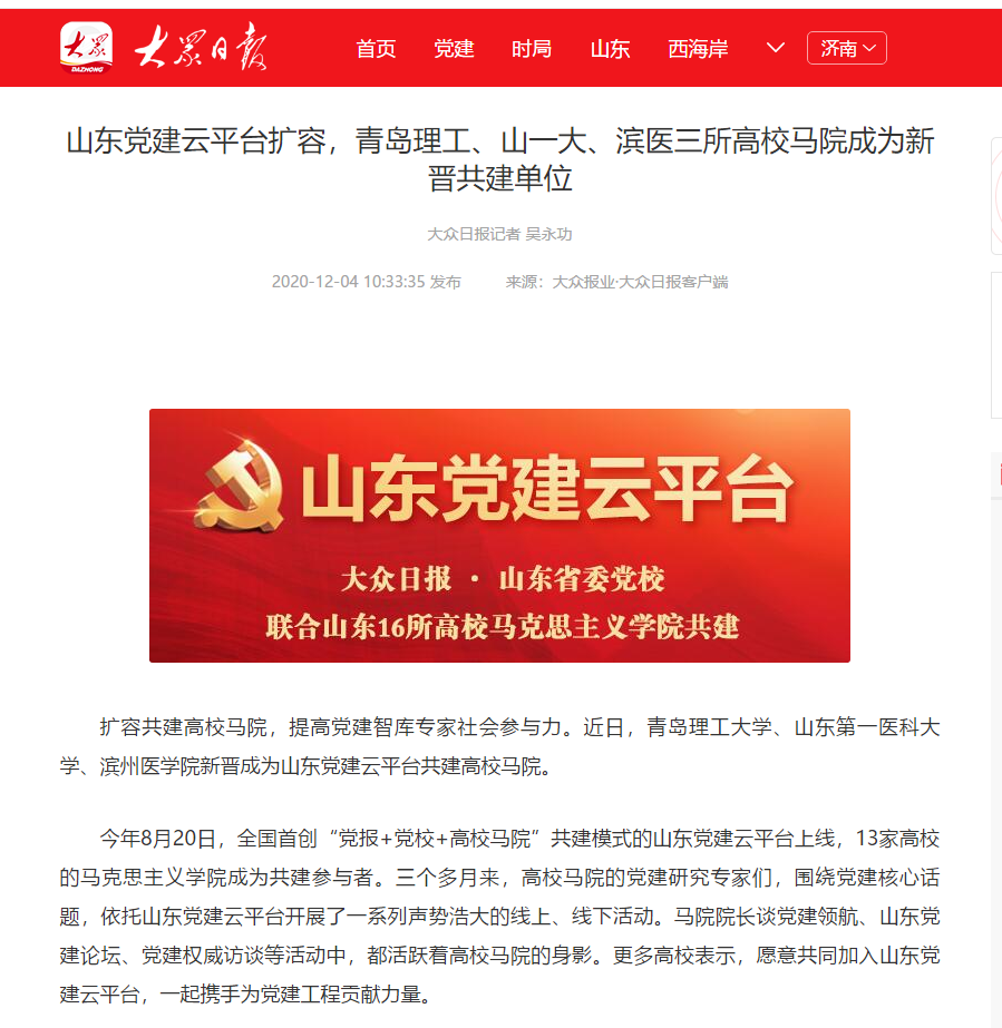 近日,经甄选研究,青岛理工大学、山东第一医科大学、滨州医学院三所高校的马克思主义学院,作为新的共建力量,加入到山东党建云平台中来。