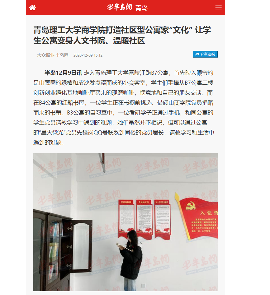 半岛12月9日讯走入青岛理工大学嘉陵江路B7公寓,首先映入眼帘的是由葱翠的绿植和皮沙发点缀而成的小会客室,学生们手捧从B7公寓二楼创新创业孵化基地咖啡厅买来的现磨咖啡,惬意地和自己的朋友交谈。而在B4公寓的红船书屋,一位学生正在书橱前挑选、借阅由商学院党员捐赠而来的书籍。B3公寓的自习室中,一位考研学子正通过手机,和同公寓的学生党员请教学习中遇到的难题,她们虽然并不相识,但可以通过公寓的“星火微光”党员先锋岗QQ号联系到同楼的党员层长,请教学习和生活中遇到的难题。