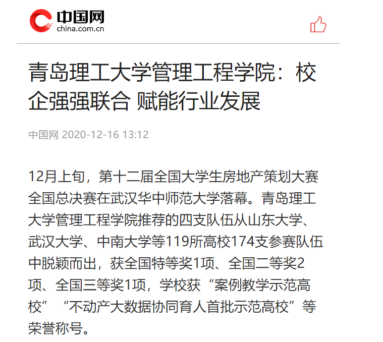 据介绍,近年来,青岛理工大学管理工程学院一直将搭建校企平台、深化产教融合视为实现“产学研用”的最佳途径,曾获得2019年中国产学研合作创新与促进奖。通过大赛平台,已将相关专业与行业内企业有机衔接,使学生受益良多,也为行业企业选拔人才提供了有效途径,受到高校与企业的双方高度认可。希望通过全力打造的产教融合创新平台,发挥大学在科技和产业技术进步的策源作用,协同开展关键核心技术人才培养、科技创新和学科专业建设,形成教育和产业统筹融合、良性互动的发展格局,打通成果转移和产业化链条,助力青岛市建设首批国家产教融合型城市。(青岛理工大学供稿)