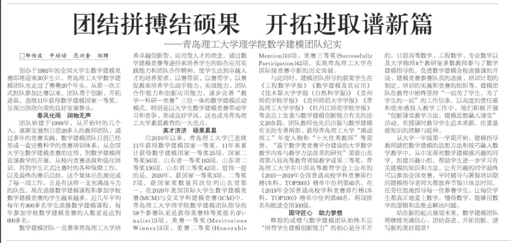 大众日报:团结拼搏结硕果 开拓进取谱新篇——青岛理工大学理学院数学建模团队纪实