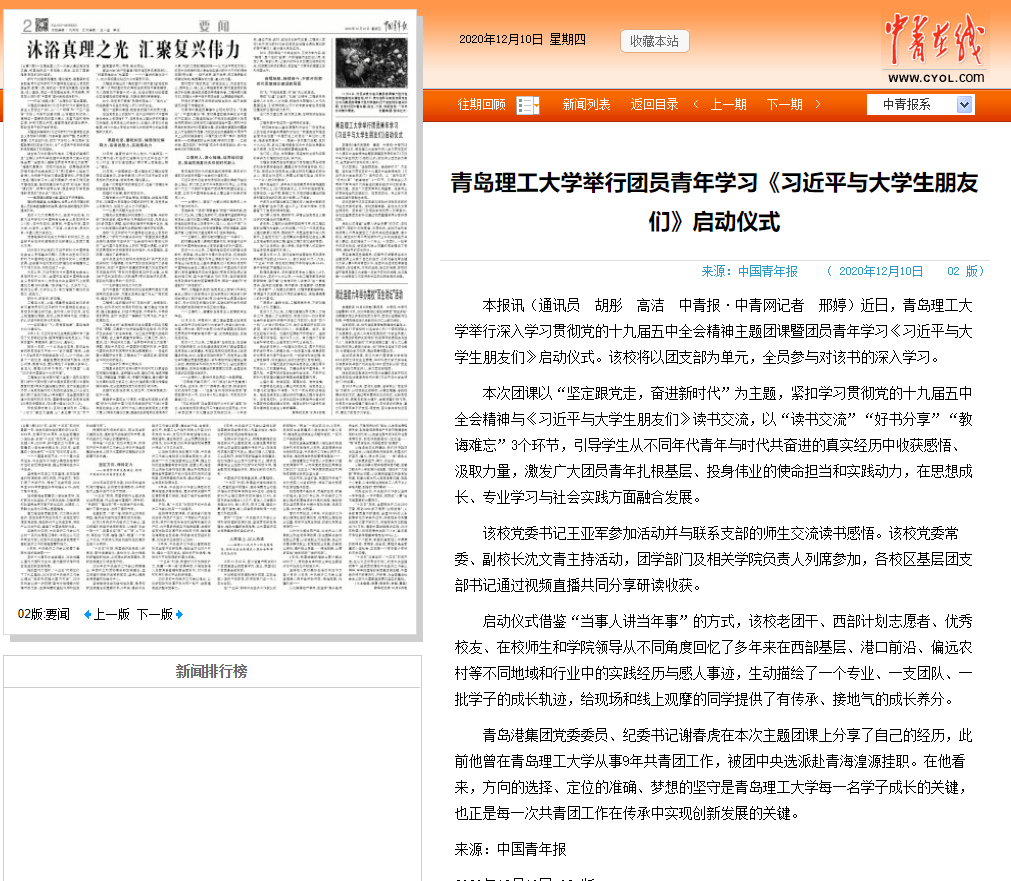中国青年报:青岛理工大学举行团员青年学习《习近平与大学生朋友们》启动仪式