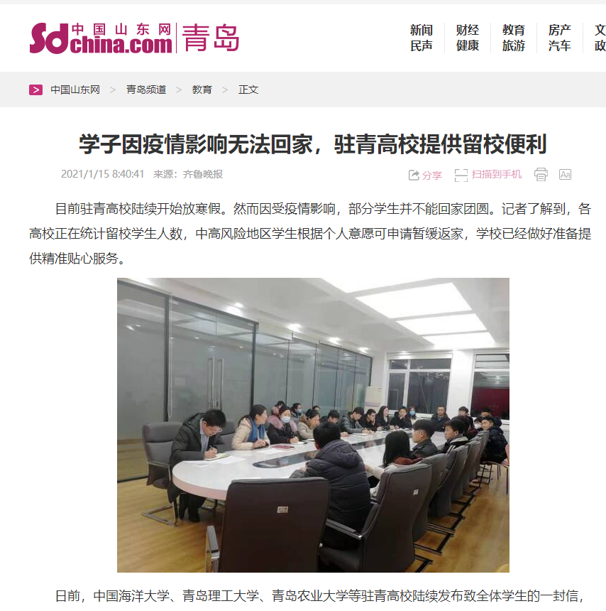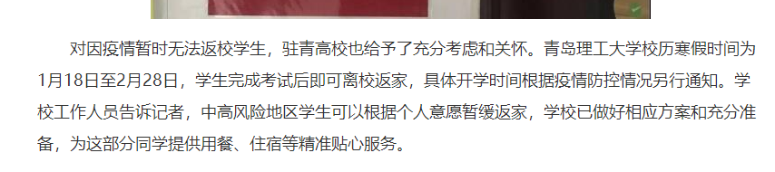 齐鲁晚报、中国山东网:学子因疫情影响无法回家,驻青高校提供留校便利