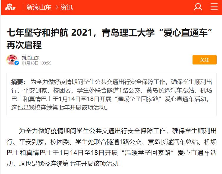 新浪:七年坚守和护航 2021,青岛理工大学“爱心直通车再次启程”