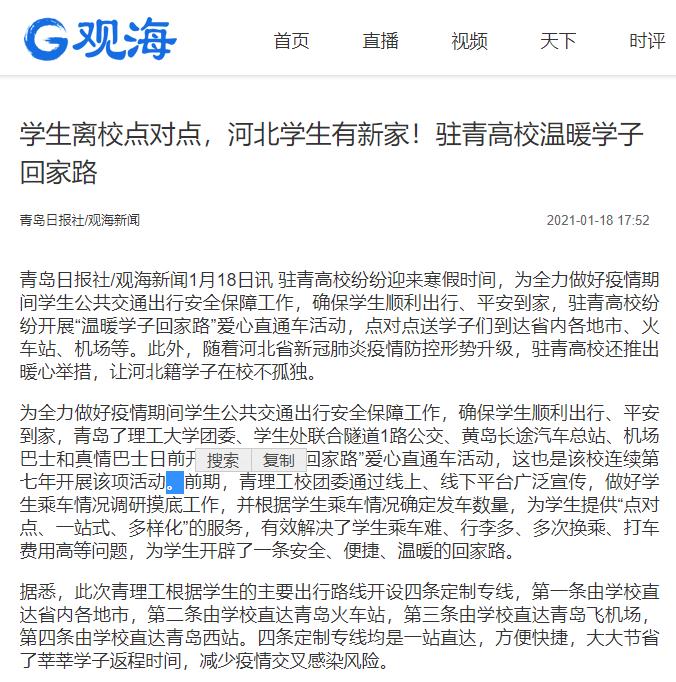 观海新闻:学生离校点对点,河北学生有新家!驻青高校温暖学子回家路