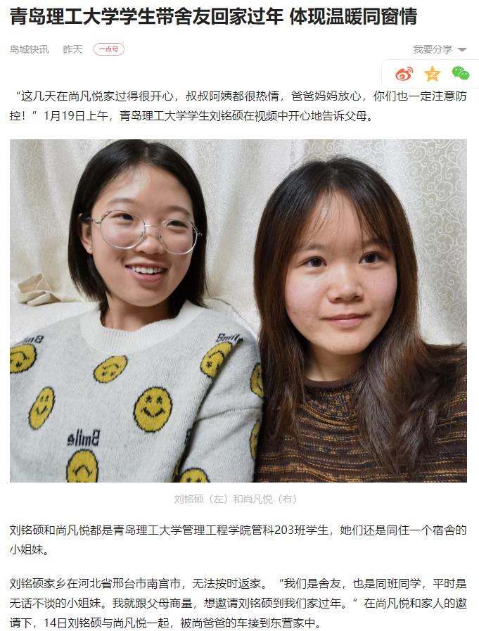新浪:“今年来我家过年!”青岛理工大学学生带舍友回家过年的温暖同窗情