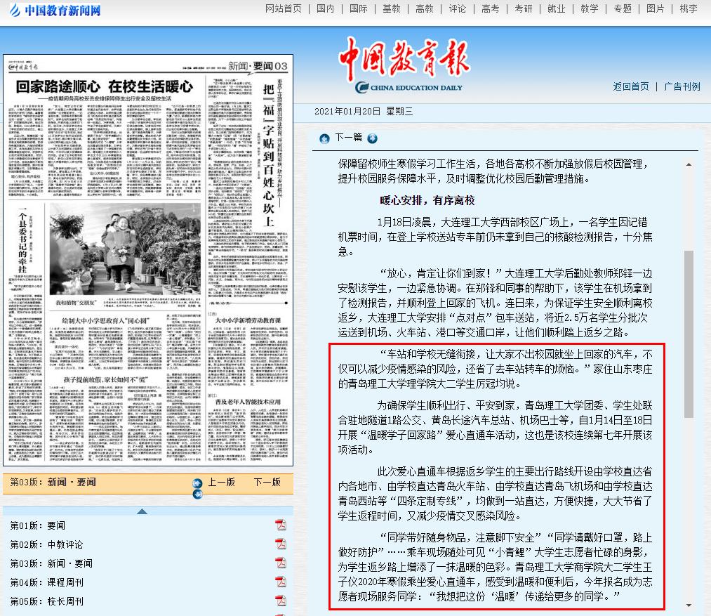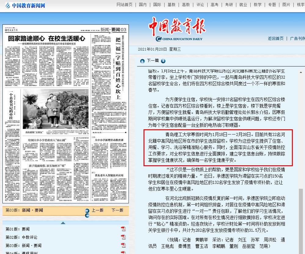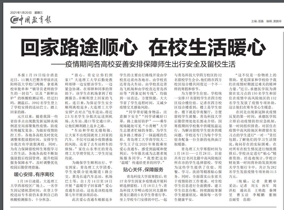 中国教育报:回家路途顺心 在校生活暖心——疫情期间各高校妥善安排保障师生出行安全及留校生活