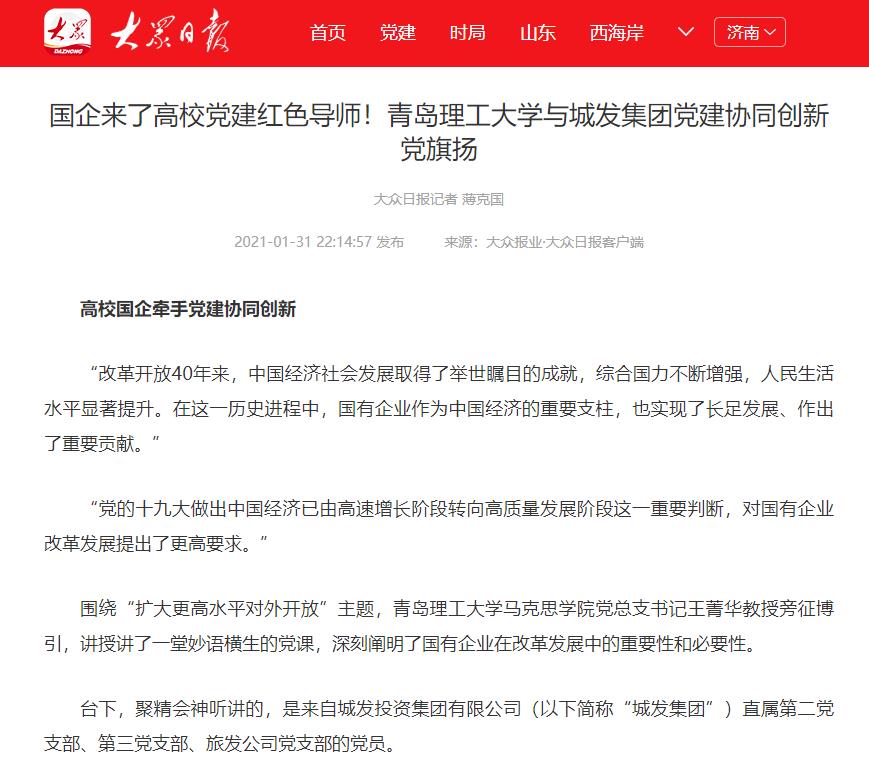 据悉,双方将持续发挥资源优势,汇聚发展合力,深入打造“红色引擎”——国企党建协同创新中心,为新时代国企党建注入澎湃源动力,建设高质量产业发展的新格局。(大众报业·大众日报客户端记者 薄克国 报道)