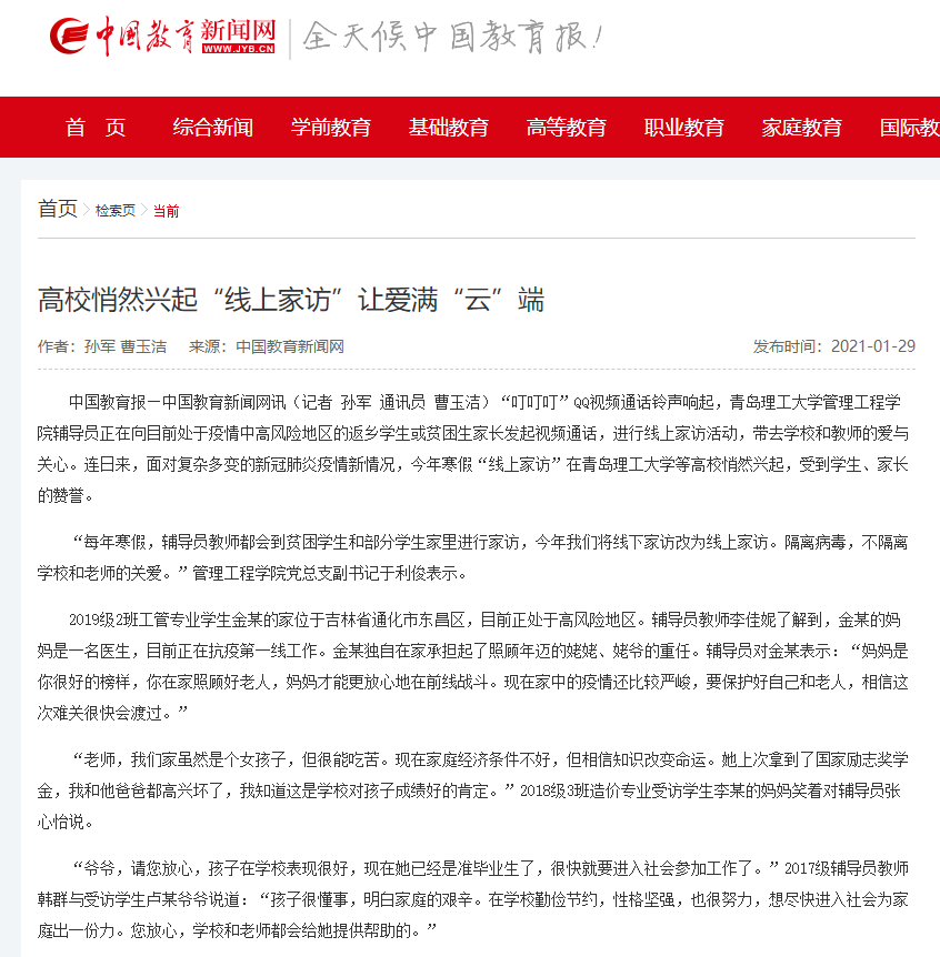 中国教育新闻网:高校悄然兴起“线上家访”让爱满“云”端