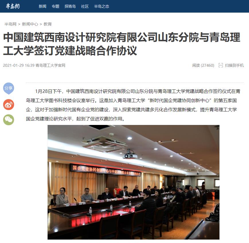 半岛网:中国建筑西南设计研究院有限公司山东分院与青岛理工大学签订党建战略合作协议