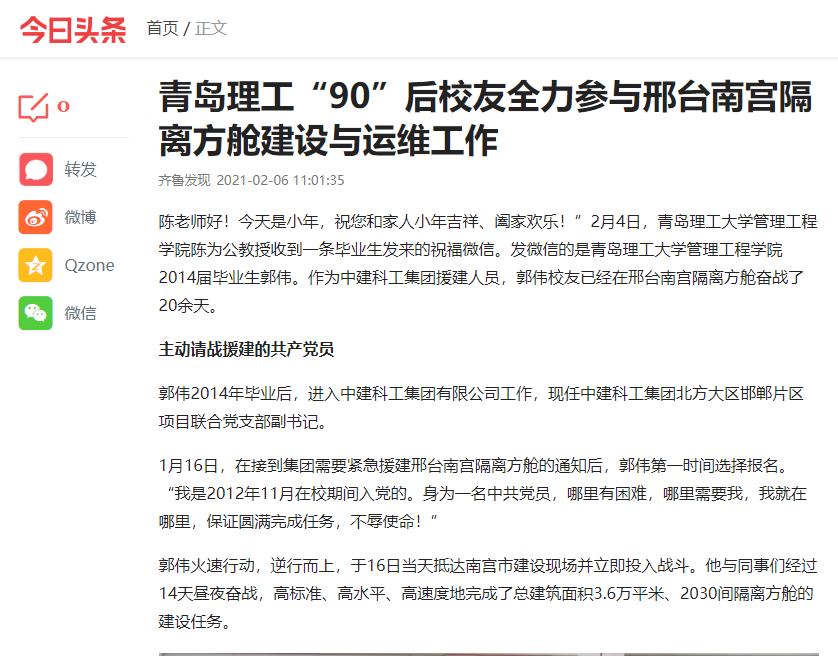 今日头条:青岛理工“90”后校友全力参与邢台南宫隔离方舱建设与运维工作