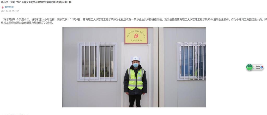 青岛早报、观海新闻:青岛理工大学“90”后校友全力参与邢台南宫隔离方舱建设与运维工作
