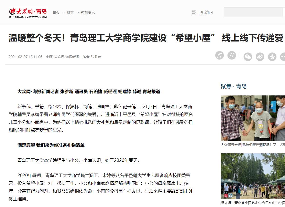 大众网:温暖整个冬天!青岛理工大学商学院建设“希望小屋” 线上线下传递爱